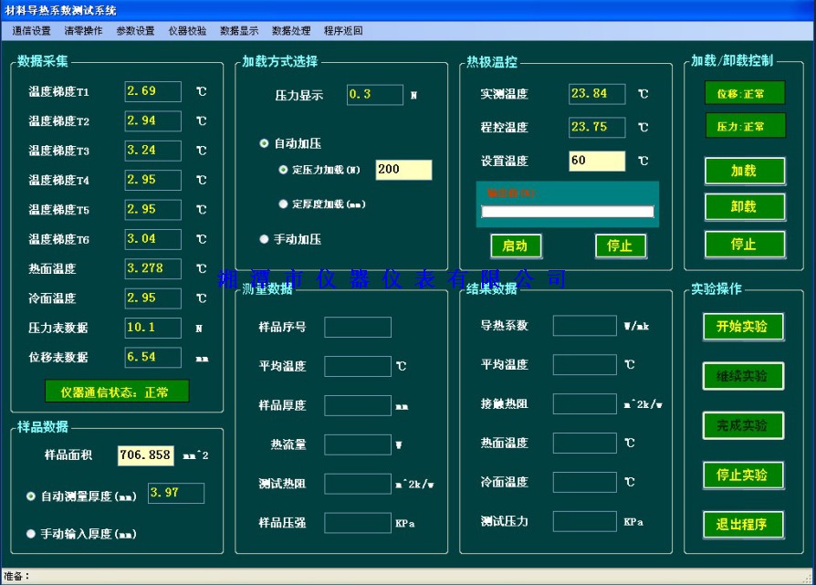 儀器特點:帶自動加壓(配用減速電機(jī)、高精度壓力傳感器、調(diào)速器),自動測厚裝置(配用高精度位移傳感器測量),并連計算機(jī)實現(xiàn)全自動控制。儀器采用6點溫度梯度檢測,提高了測試精度??蓹z測不同壓力下熱阻曲線,采用優(yōu)化的數(shù)學(xué)模型,可測量材料導(dǎo)熱系數(shù)和熱阻以及界面處接觸熱阻等多個參數(shù)。